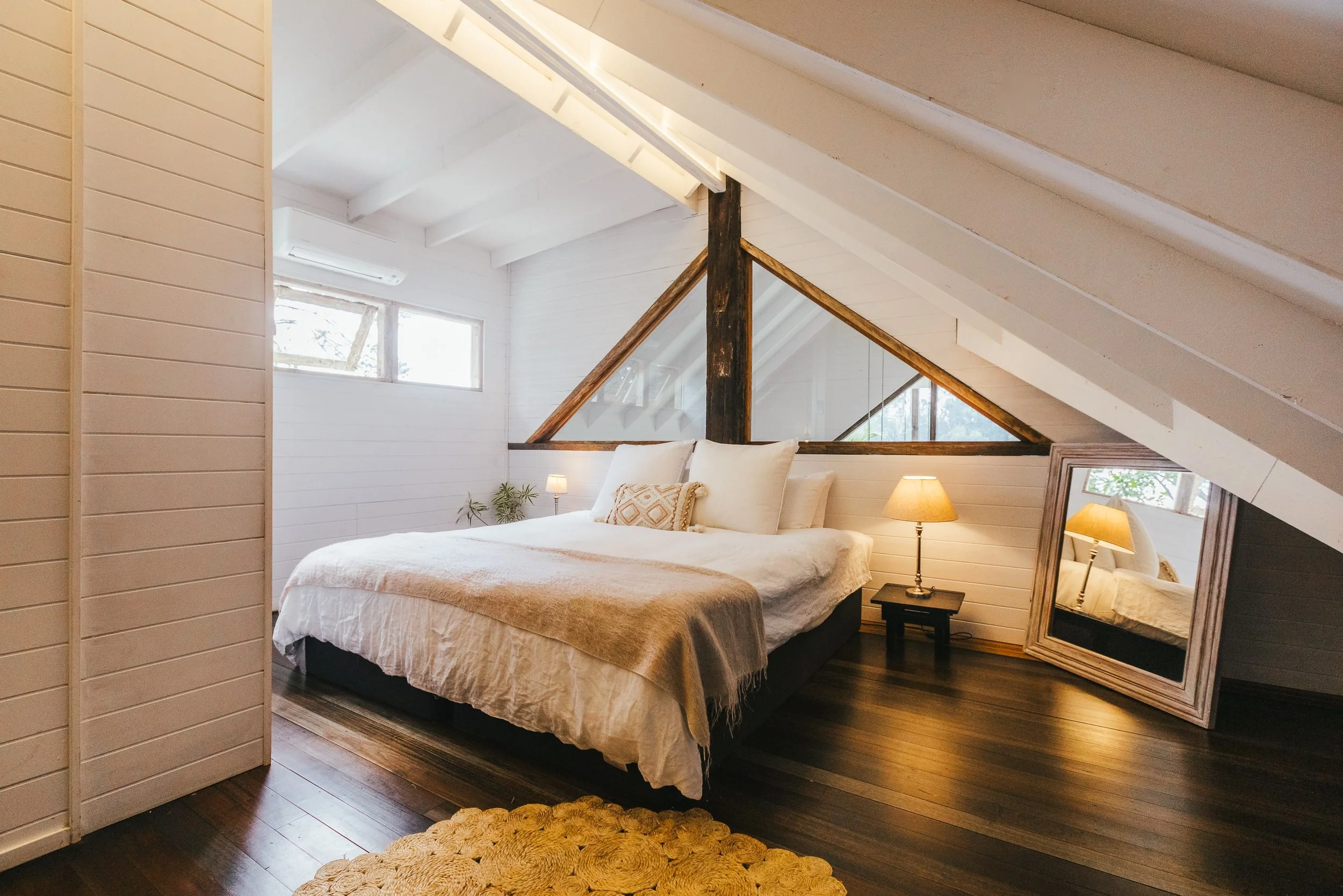 Situated on the ground floor with raked ceilings. This light-filled bedroom downstairs is adjacent to the downstairs bathroom which has an extra-large terrazzo handmade bath perfect for an indulgent soak.